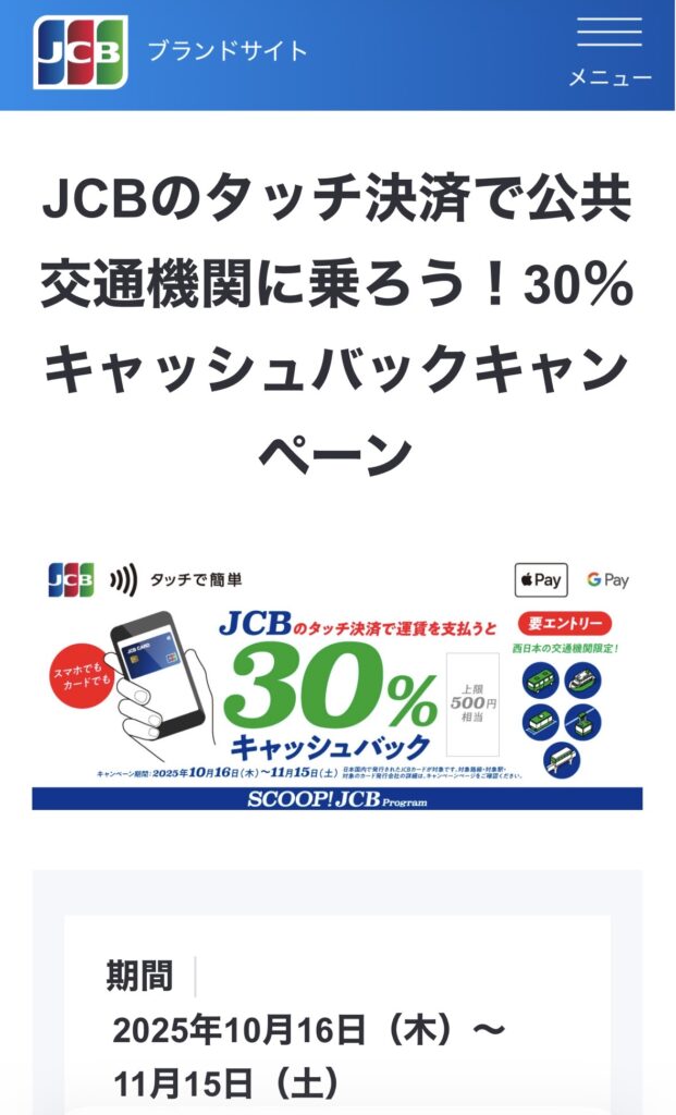 JCBのタッチ決済で30%キャッシュバックのキャンペーンが開催中です