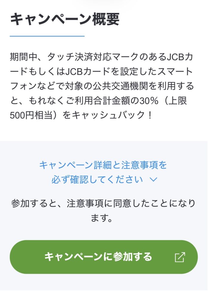 タッチ決済対応マークのあるJCBカードもしくはJCBカードを設定したスマートフォンなどで対象の公共交通機関を利用すると、もれなくご利用合計金額の30%(上限500円相当)をキャッシュバック!