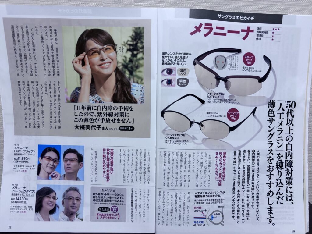 サングラスについては、白内障対策のために「薄色サングラス」を取り扱っているのは変わらないのですが、私の知る限りで、このメラニーナの前に2つほど別の商品がピカイチとして扱われていました(その2つとも自分で買ったので覚えています^^)