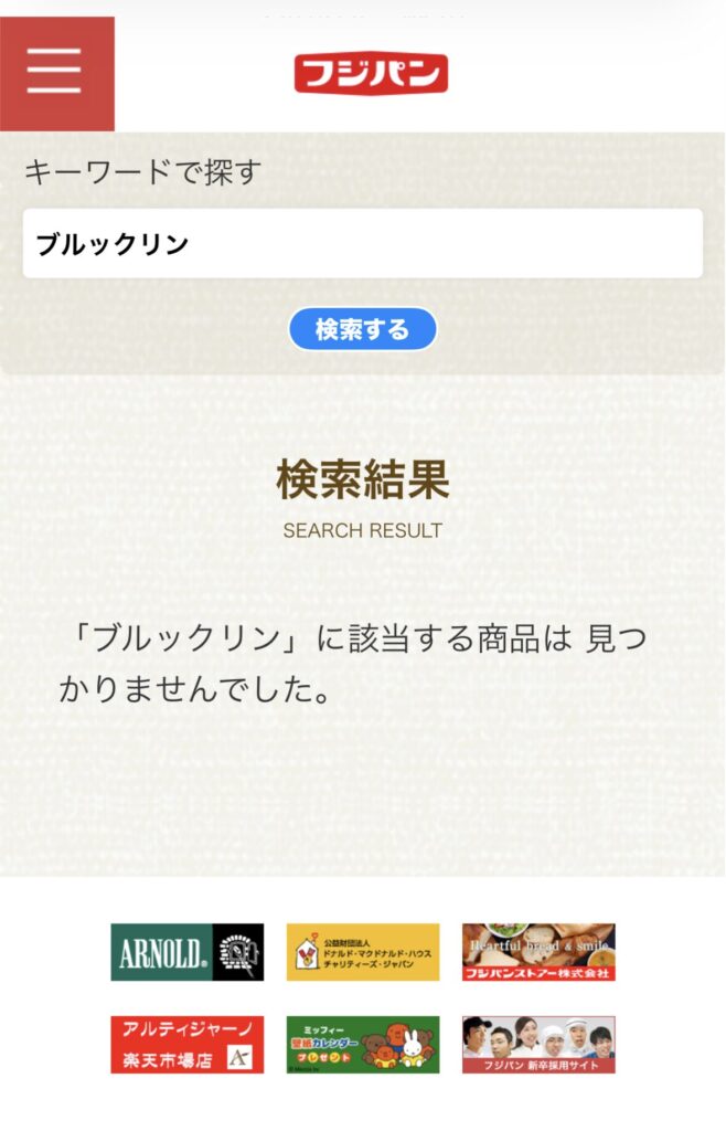 フジパンの公式サイトで「ブルックリン」をキーワードに検索してみましたが、見つかりません…
