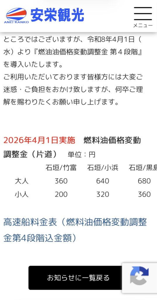 現在、石垣島から波照間島行きの乗船券は4,990円です。この内訳は運賃3,150円、燃料油価格変動調整金改定(第4段階導入)1,840円となっています