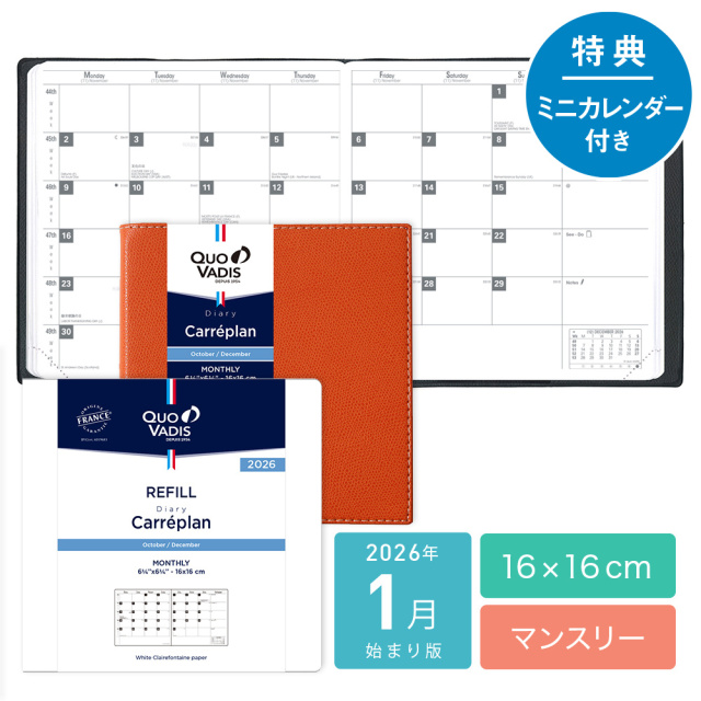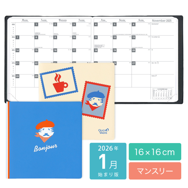 クオバディスのユニークな正方形サイズのマンスリーダイアリー。薄く、持ち運びやすい軽さのダイアリーです。ダイアリーページとノートの程よいバランスが特徴です。